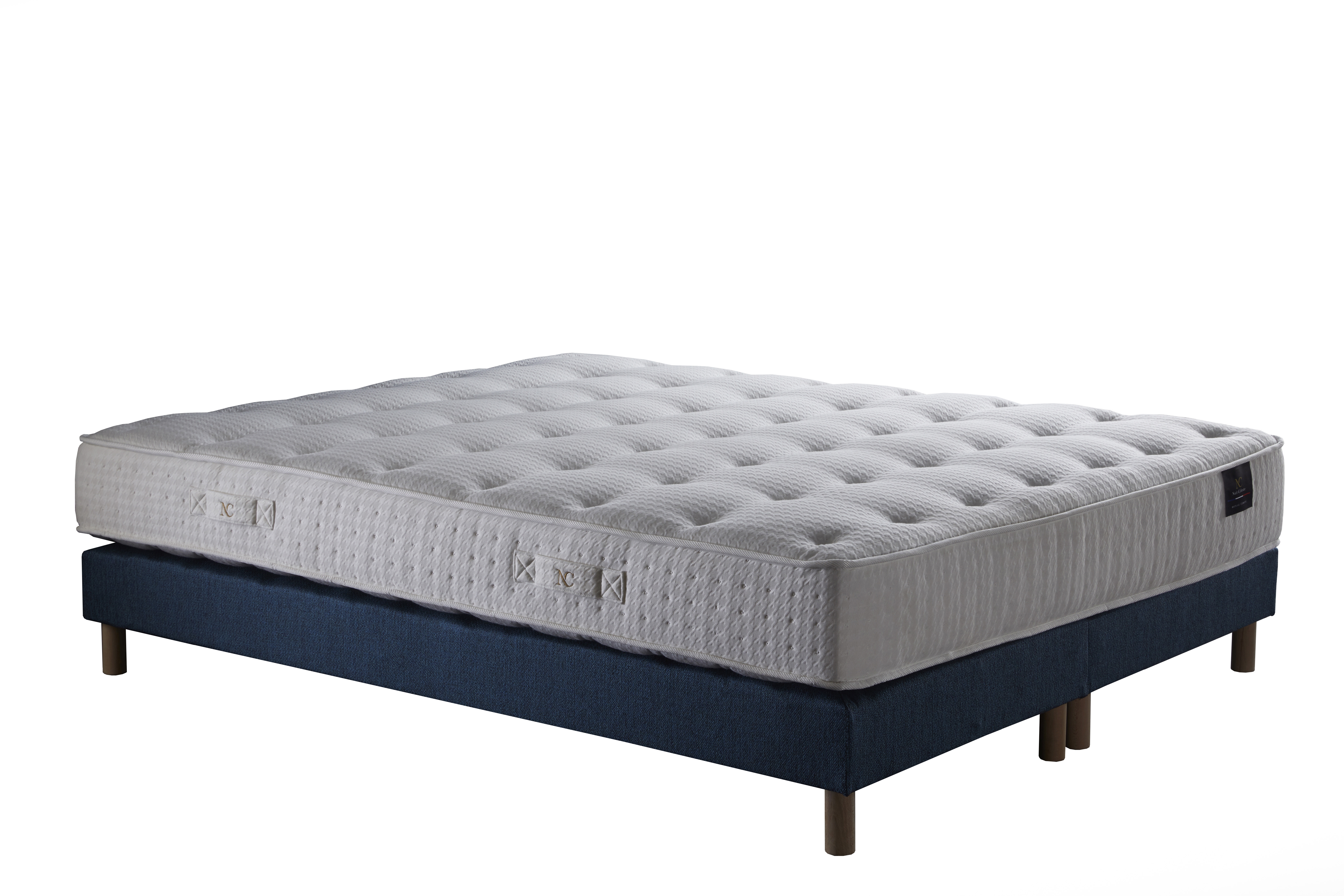 Habillé du coutil stretch Pied-de-Poule, signature élégante de Nuit Céleste, le matelas est orné de poignées brodées “NC – Nuit Céleste” et d’un galon blanc 40 mm. Le sommier tapissier à lattes fixes apporte un soutien homogène, tandis que la tête de lit capitonnée sublime l’ensemble avec raffinement.