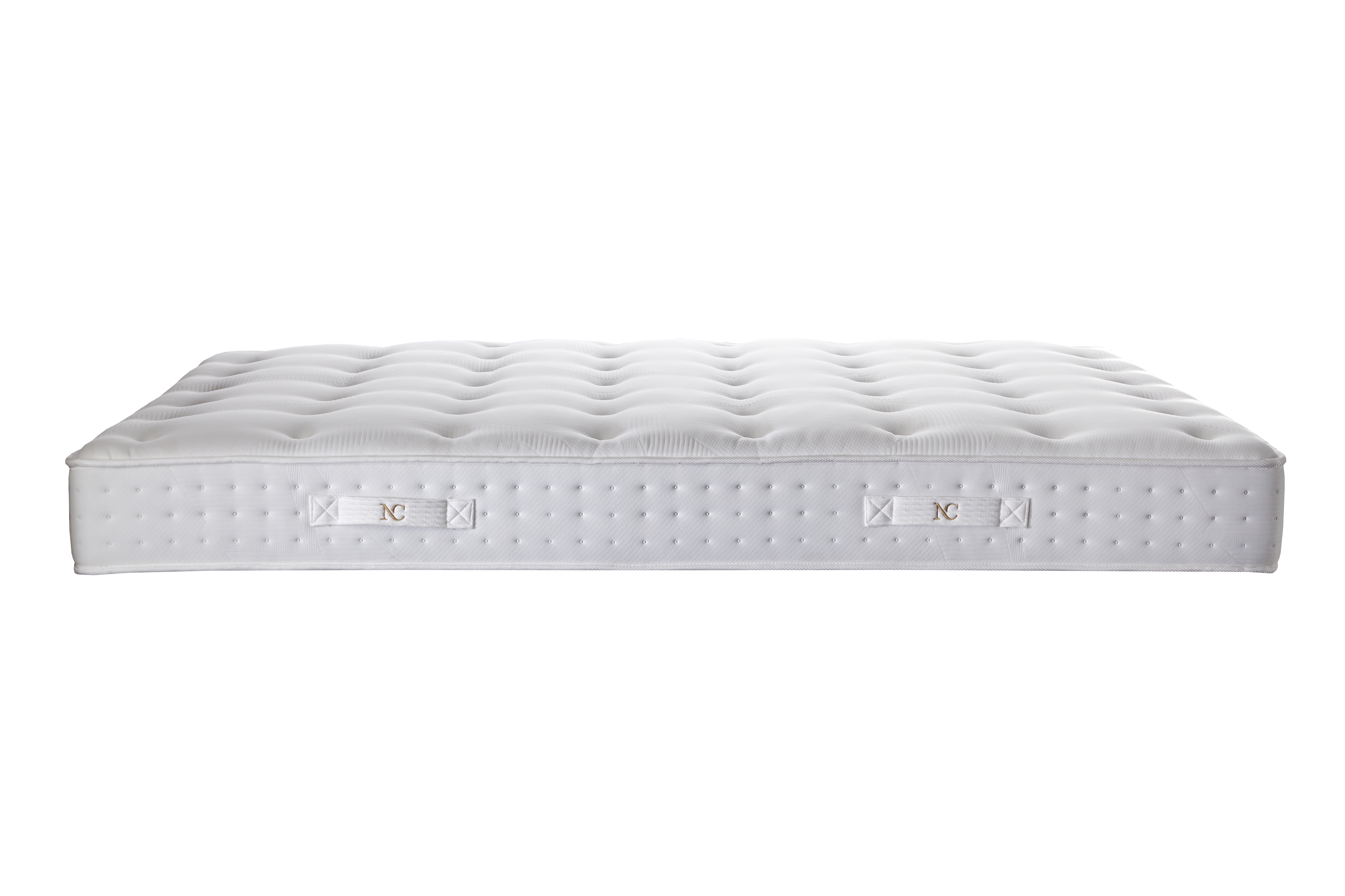 Le coutil stretch Pied-de-Poule, emblème de Nuit Céleste, confère au matelas une allure raffinée et intemporelle. Les poignées horizontales brodées “NC – Nuit Céleste”, la plate-bande microfibre blanche et le galon 40 mm témoignent de la qualité artisanale et de l’exigence de fabrication française.